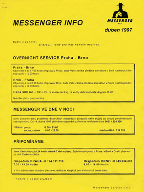 Nebojte, nechceme bilancovat v tomto dopise. Připravili jsme speciální microsite na http://www.messenger.cz/25, kde si můžete prohlédnout naše klíčové milníky. Co tam třeba najdete? Zjistíte, jak jsme se stali z pražské kurýrky celorepublikovým přepravcem. Jak jsme experimentovali s rozvozem potravin s mottem „od rohlíku po letenky“. A taky jsme byli v Maximu.